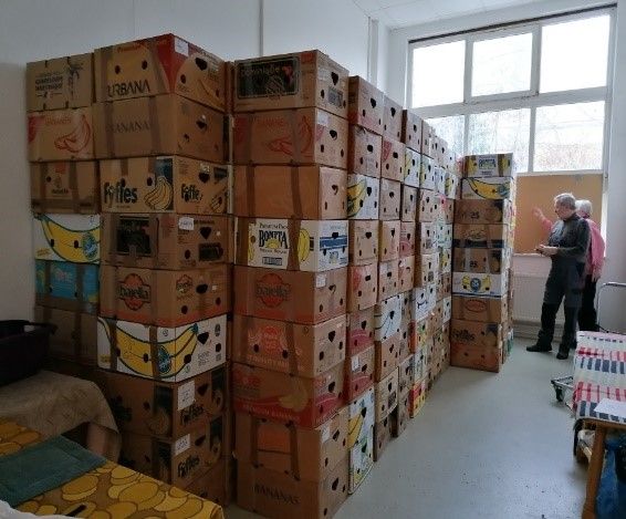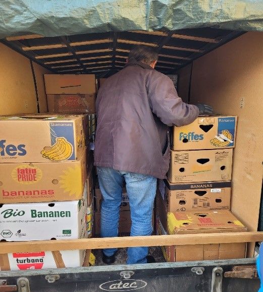 Am Nachmittag beladen wir nun doch wieder unsere Anhänger – aber mit leeren Bananenkartons. Diese benötigen wir für unsere nächsten Hilfsgüter und müssen sie nicht mühevoll von einzelnen Einkaufsmärkten erbitten.