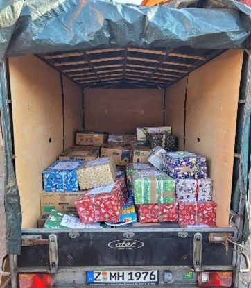 Ausladen und Verteilung der Weihnachtspakete und Geschenktüten